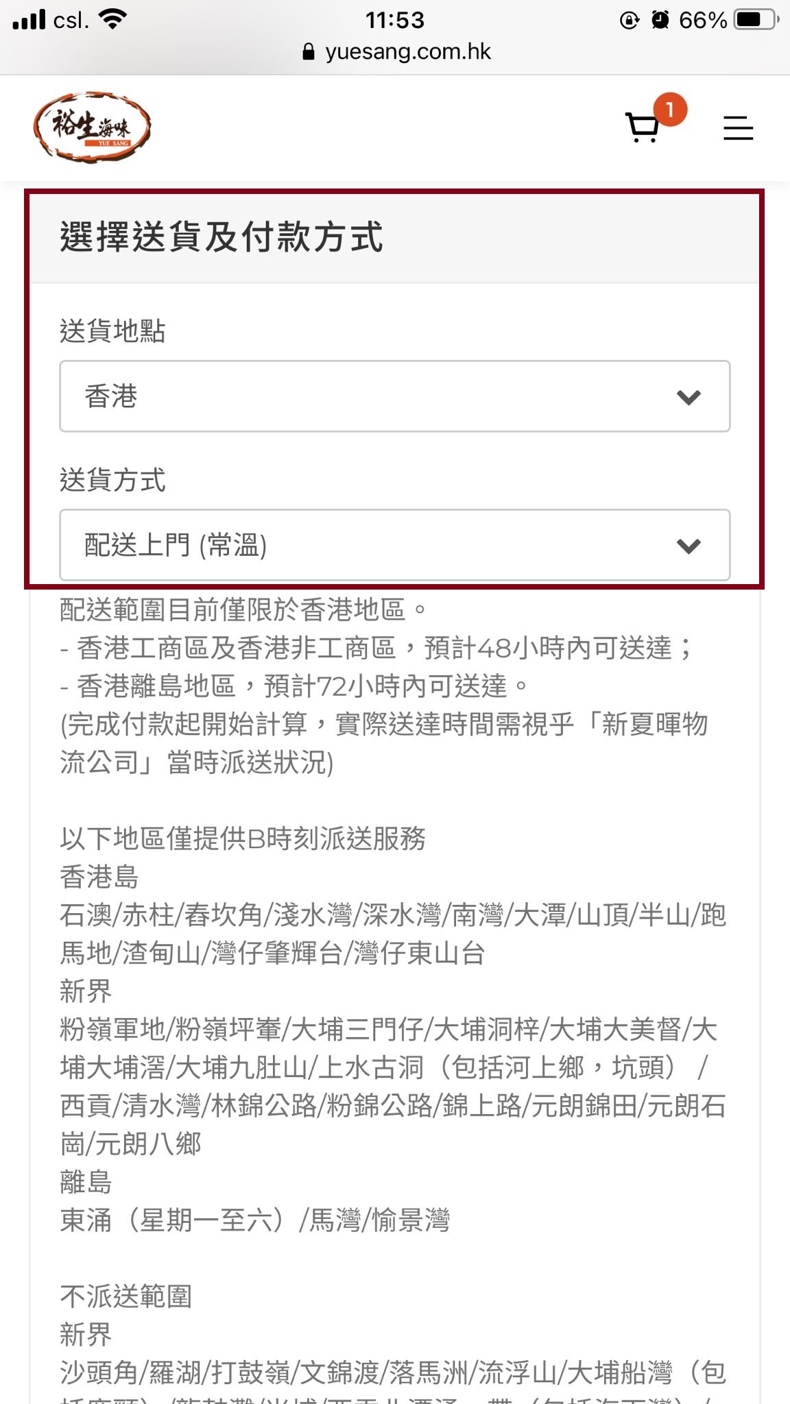 5. 選取送貨方式: 配送上門 (常溫) / 免費於本公司自提點自取