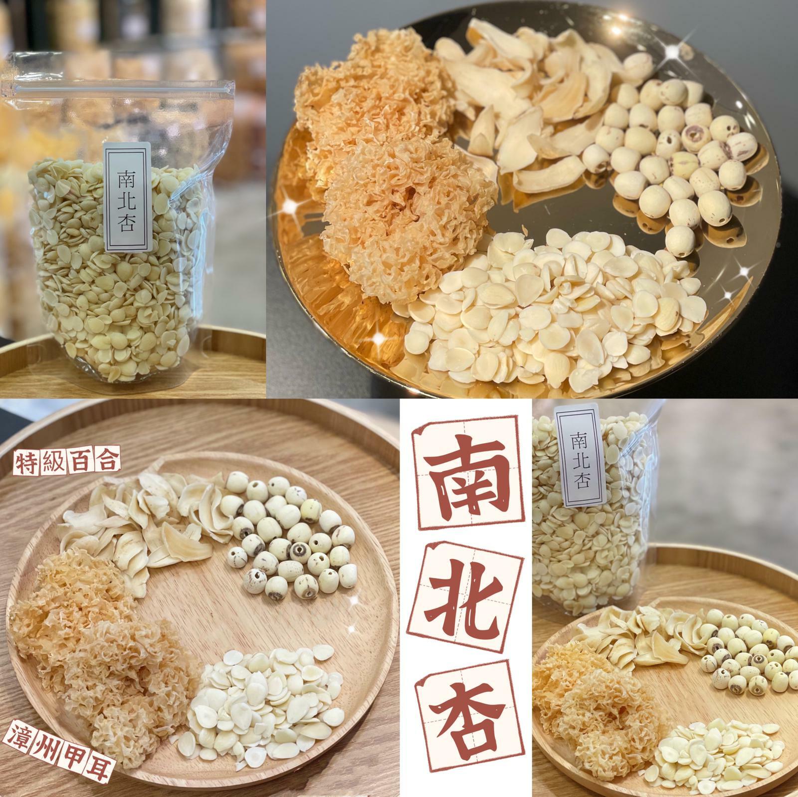 南北杏為薔薇科植物杏的乾燥種子,分為甜杏仁又稱【南杏】,多用作製造副食品,及苦杏仁又稱【北杏】,多作藥用,兩者均有食療功效,而 南杏4兩 撈 北杏1兩 即成【南北杏】,主產於中國湖北地區。